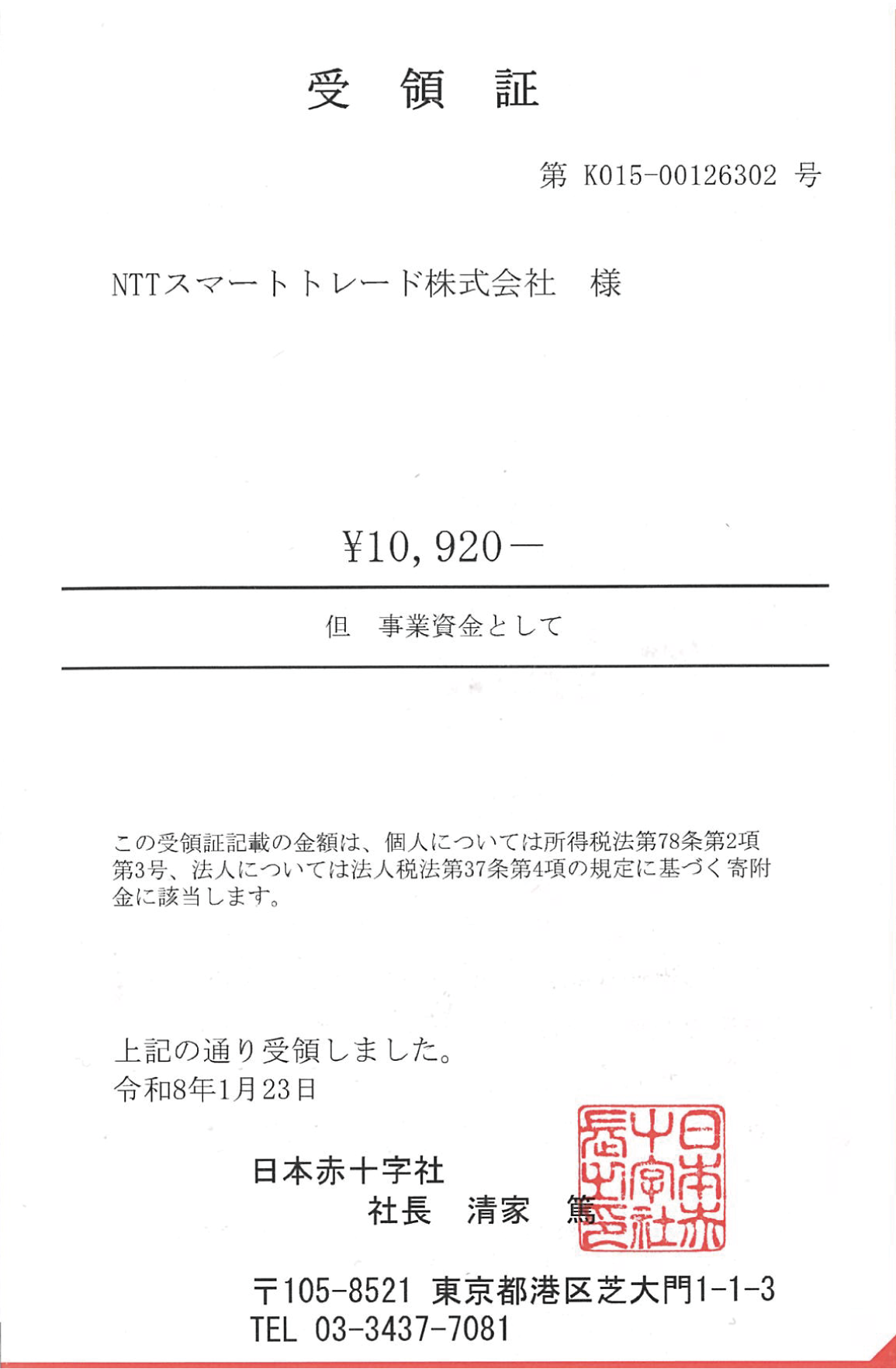 日本赤十字社 受領証